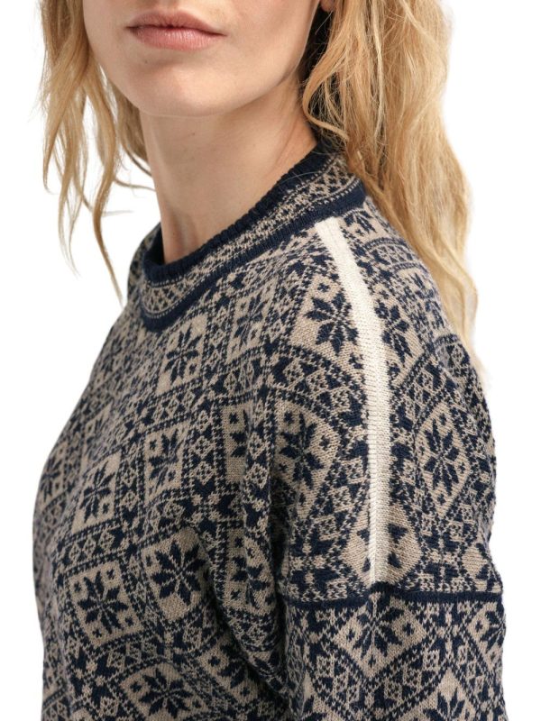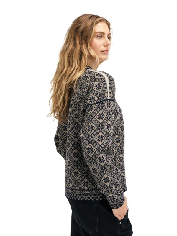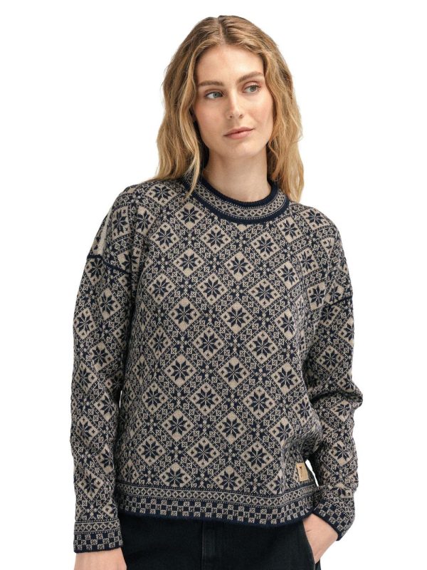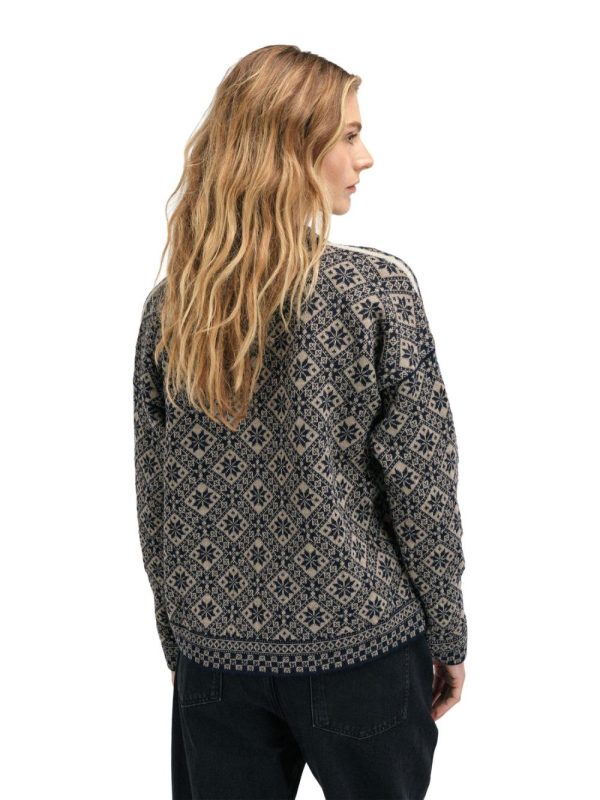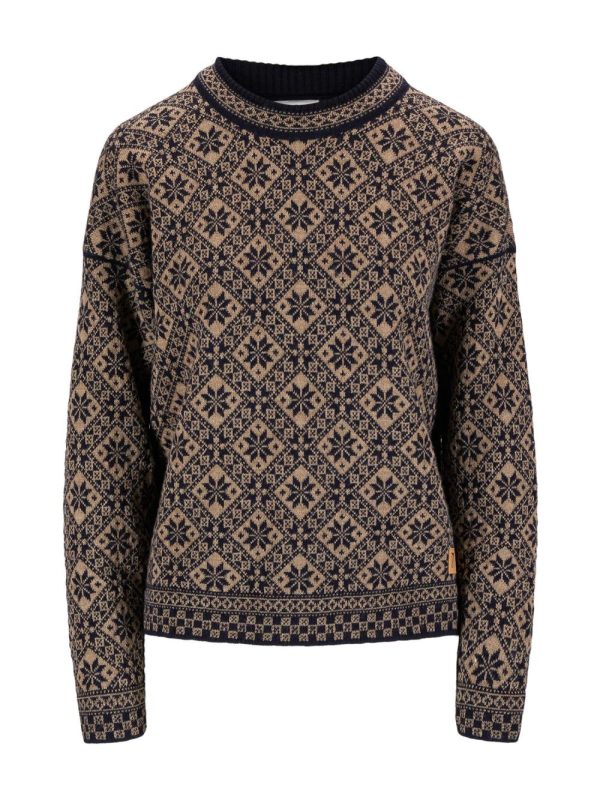 The original Sotra sweater originates from the Sotra island, west of Bergen, exposed to the harsh weather from the North Sea. On this island a variation of the eight-petal rose pattern emerged: The roses are separated by diagonal lines on a contrasting background, giving us an intricate geometrical pattern. It is believed that the eight-petal rose came to the island around 1850, introduced by traders and sailors from the Hardanger region. The Sotra sweater was most likely worn at celebrations and special occasions only.