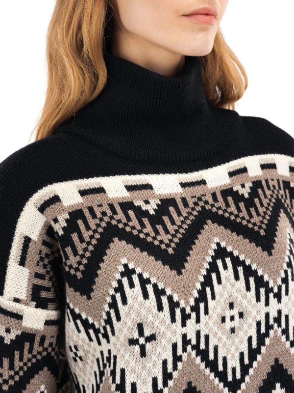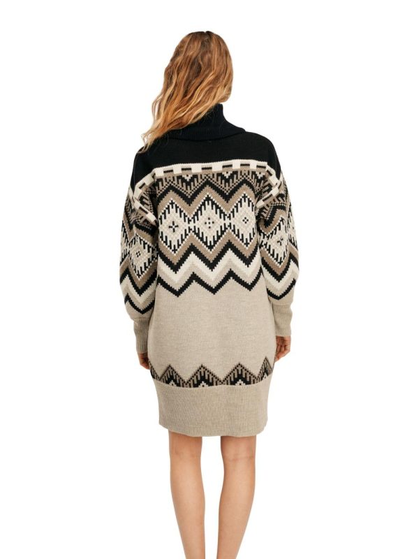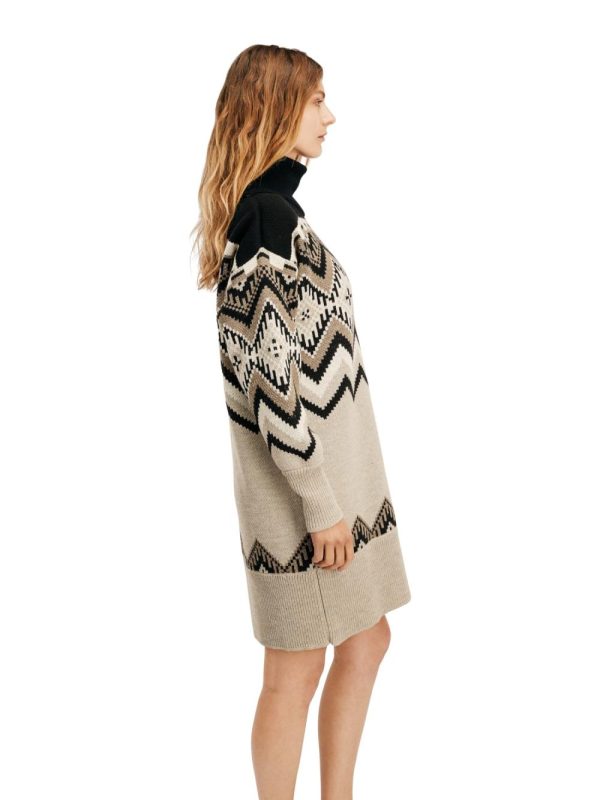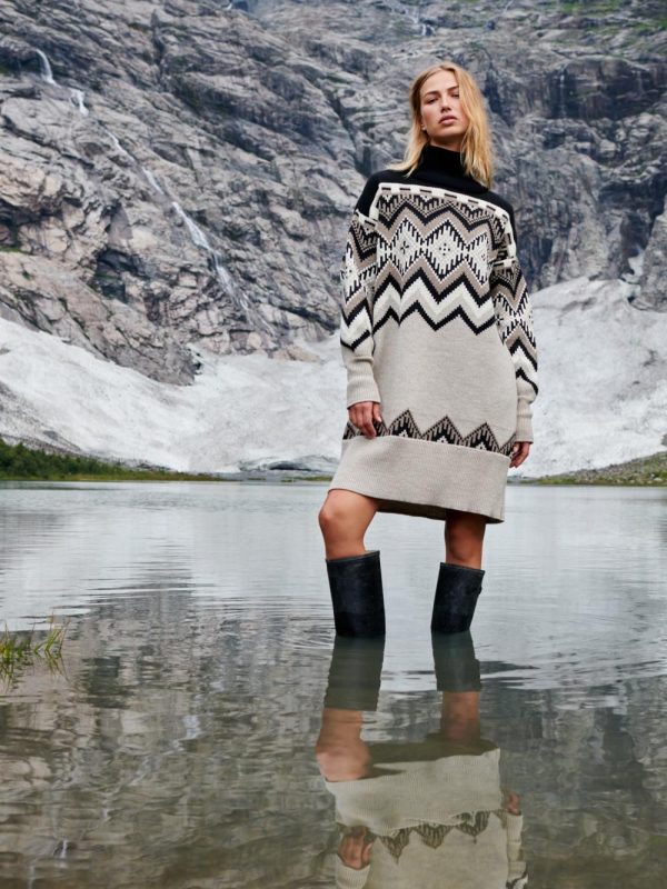 The inspiration for this dress comes from classic, knitted ski sweaters. A classic Dale pattern in four colors has been enlarged and pixelated. The dress has a high neckline with soft merino wool on the inside. The high, slim rib knit gives the dress a voluminous effect into the sleeve. Skåla is a dress with a generous comfort factor and wide fit, that can be both styled with our Vøring wool pants or a pair of thick tights.