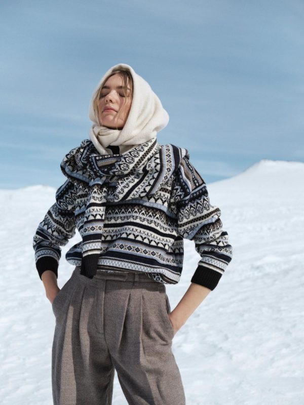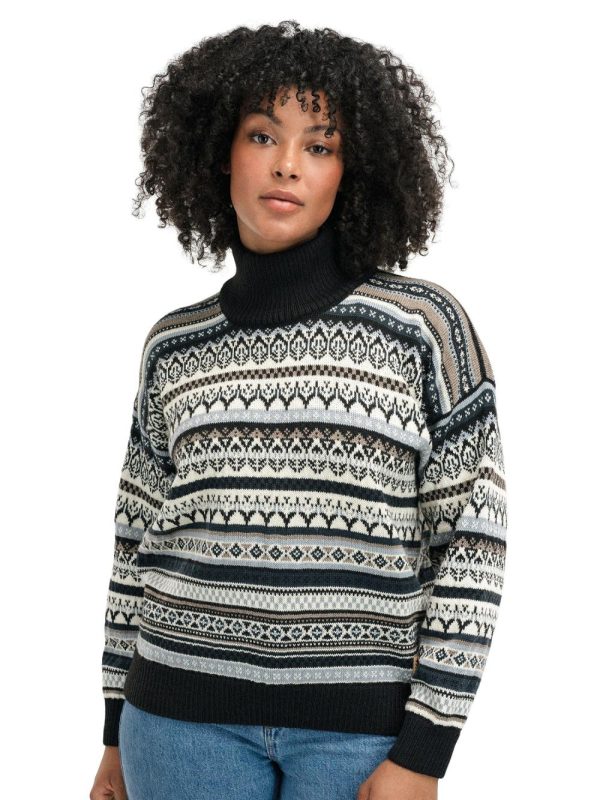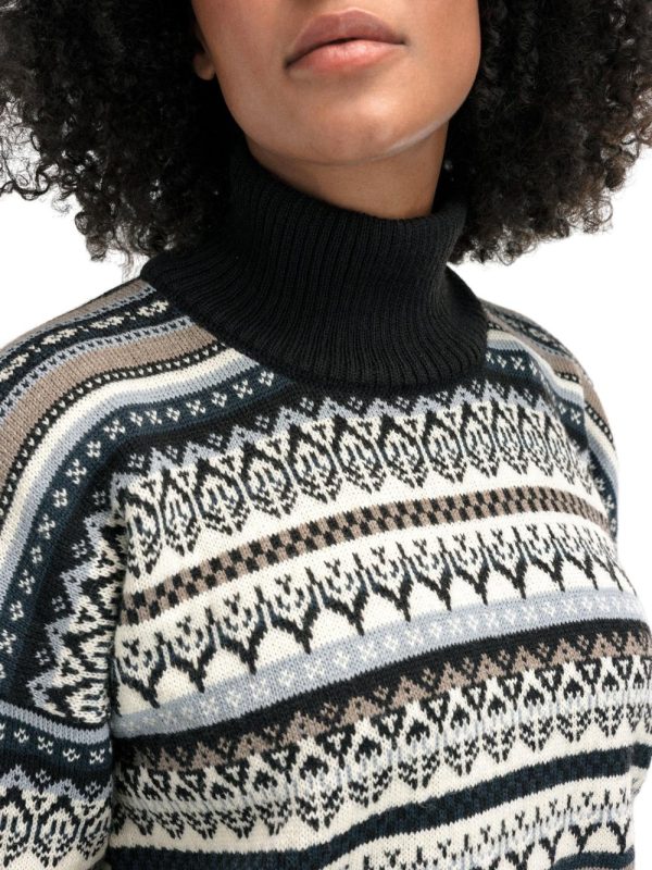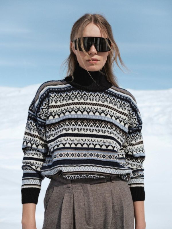 A playful, detailed and fully patterned wool sweater with dropped shoulders and a high neck. Utsira has a wide silhuette with smaller rib endings at the sleeves and hem, giving the sweater a relaxed and oversized fit. The sweater is knitted in 100% longasting wool. The pattern is a mix of historical Dale patterns.